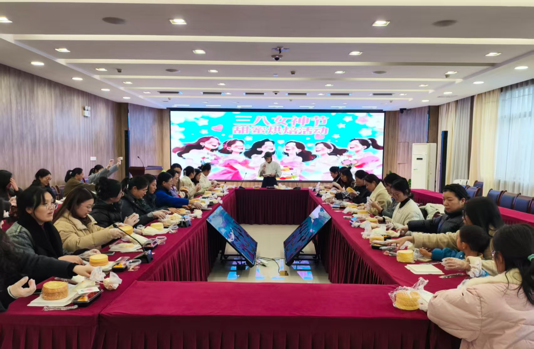 活动现场暖意融融、香气四溢。工作人员提前备好新鲜蛋糕胚、绵密奶油、缤纷水果等食材与烘焙工具,专业烘焙老师现场细致讲解蛋糕制作步骤,从奶油抹面、裱花造型到水果搭配,手把手进行指导。参与活动的女教职工们兴致高涨,纷纷化身“烘焙达人”,相互协作、交流心得,有的细心涂抹奶油,有的创意装饰蛋糕,指尖流转间,一个个独具特色、精致可爱的蛋糕逐渐成型,现场欢声笑语不断,洋溢着温馨欢乐的节日氛围。